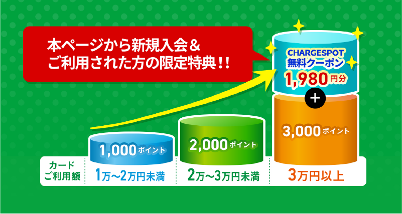 ご利用期間中に3万円(税込) 以上クレジット払いをご利用いただくと、さらにCHARGESPOTで使用できる330円分のクーポンを6枚(計1,980円分)進呈いたします。