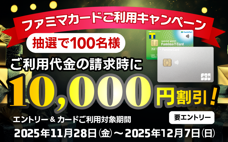 期間中にエントリーのうえ、ファミマカードでクレジット払いをご利用いただくと、期間中のクレジット払いご利用合計金額10,000円(税込)を1口として、抽選で100名様にショッピングご利用代金から10,000円を割引いたします。★オンラインショッピングでのご利用分は、口数が10倍になります!★