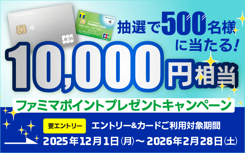 期間中にエントリーのうえ、キャンペーン対象カードでクレジット払いをご利用いただくと、ご利用合計金額10,000円(税込)ごとに1口として、抽選で500名様にファミマポイント10,000円相当をプレゼントいたします。※ファミマポイントの進呈にはファミペイ連携が必要です。ファミペイ連携方法はこちら