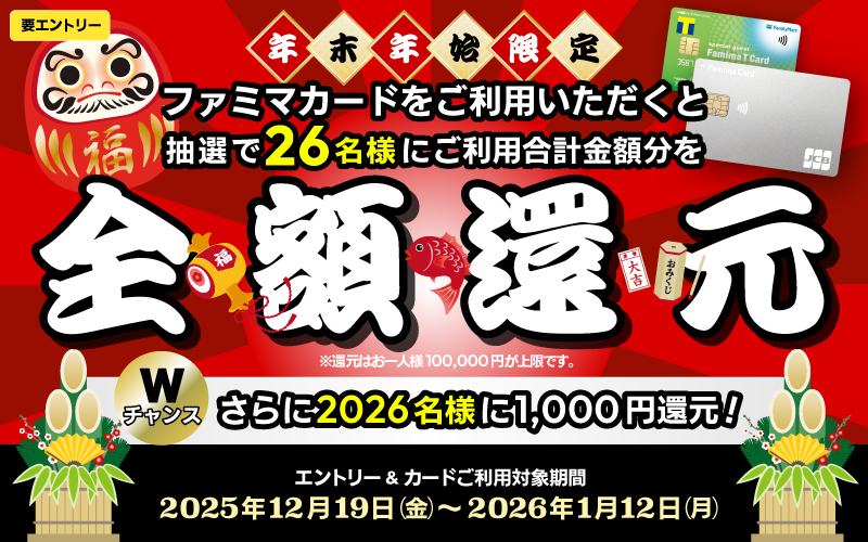 期間中にエントリーのうえ、ファミマカードでクレジット払いをご利用いただくと、期間中のクレジット払いご利用合計金額10,000円(税込)を1口として、抽選でご利用代金の請求時に割引いたします。<全額還元賞>