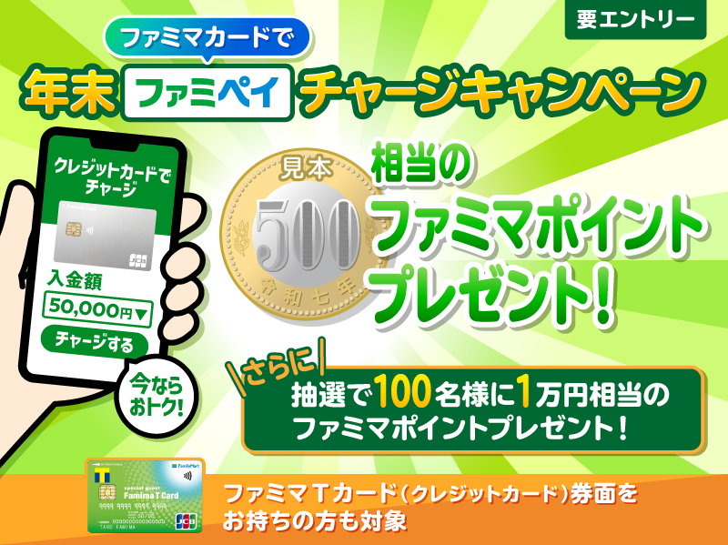 期間中にエントリーのうえ、キャンペーン対象カードでファミペイチャージを合計50,000円以上クレジットカードチャージするとファミマポイント500円相当をもれなくプレゼントいたします。さらに抽選で100名様にファミマポイント10,000円相当をプレゼント!
