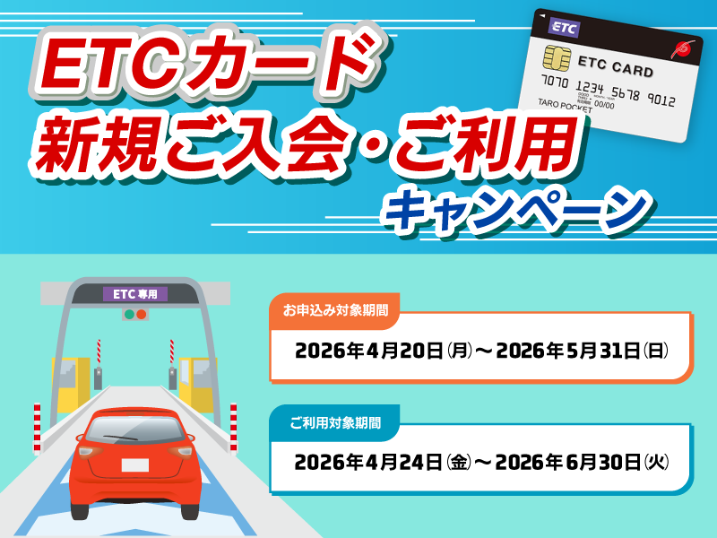 ●本キャンペーンはエントリー不要です。●ETCカード申込書による郵送でのお申込みの場合、2026年5月31日(日)までに当社に申込書が到着した分がキャンペーンの対象となります。余裕をもってお申込みください。なお、申込書の到着日に関するお問い合わせにはお答えできませんので、あらかじめご了承ください。
